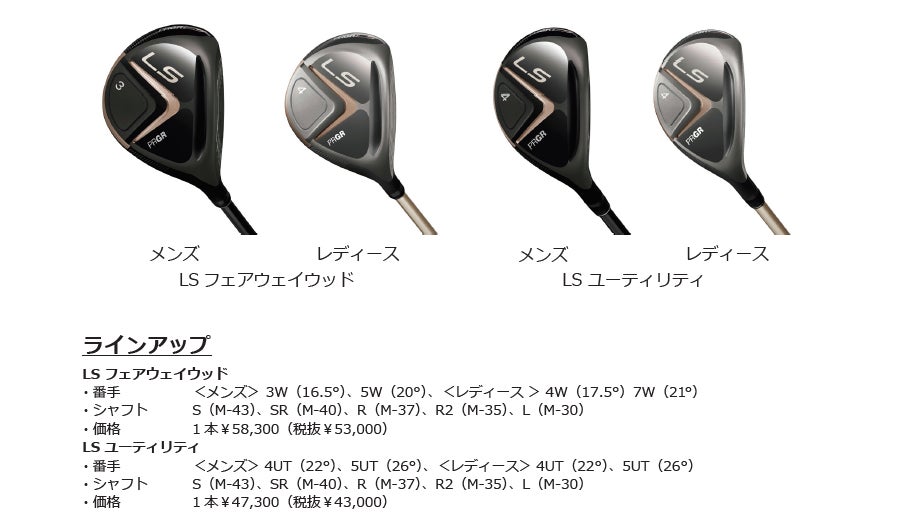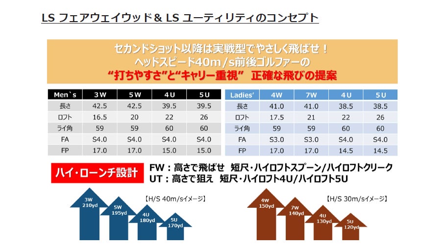 (株)プロギアは、ヘッドスピード40m/s前後のゴルファーに向けた「LS(エルエス)」シリーズから「LSフェアウェイウッド」「LSユーティリティ」を5月19日から発売します。打ちやすさとキャリー重視の正確な飛びでスコアアップが狙えるやさしい実戦型クラブに設計しました。同様のコンセプトで女性の平均的なヘッドスピード30m/s前後のゴルファー向けに専用設計を施したレディースモデルもラインアップします。