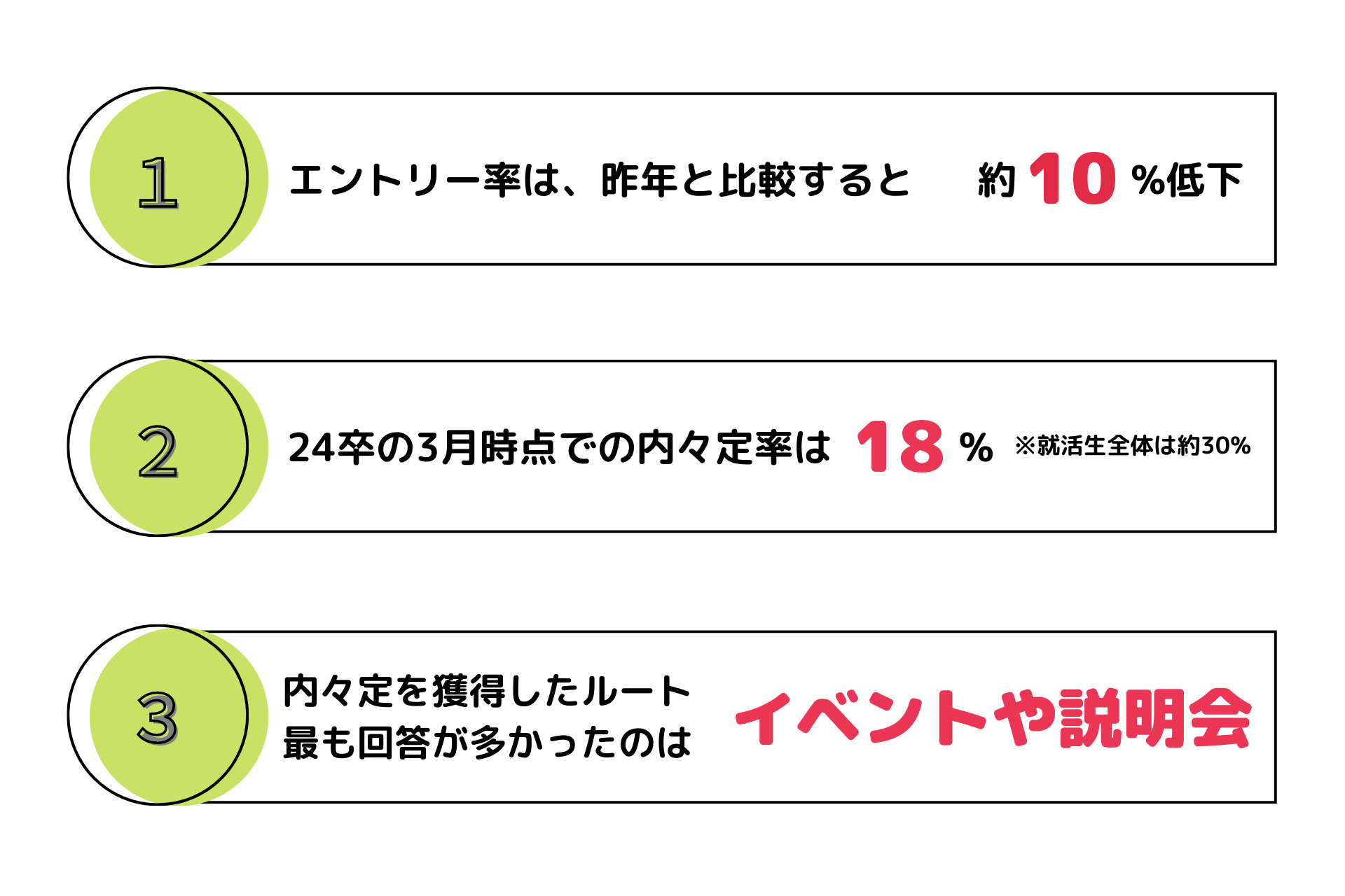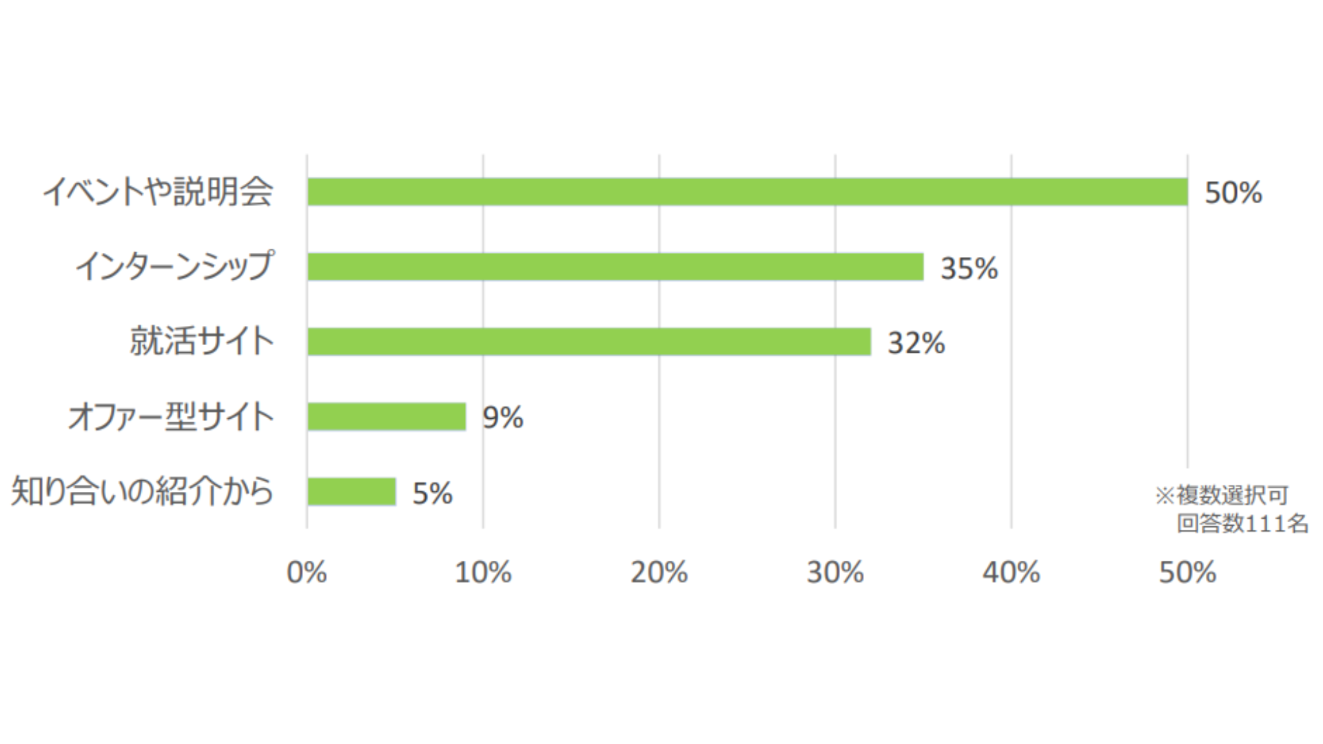 半数の学生が【イベントや説明会】経由で内々定を獲得していることがわかった。また、割合として多くはないものの【オファー型サイト】経由も一定数いることがわかった。
