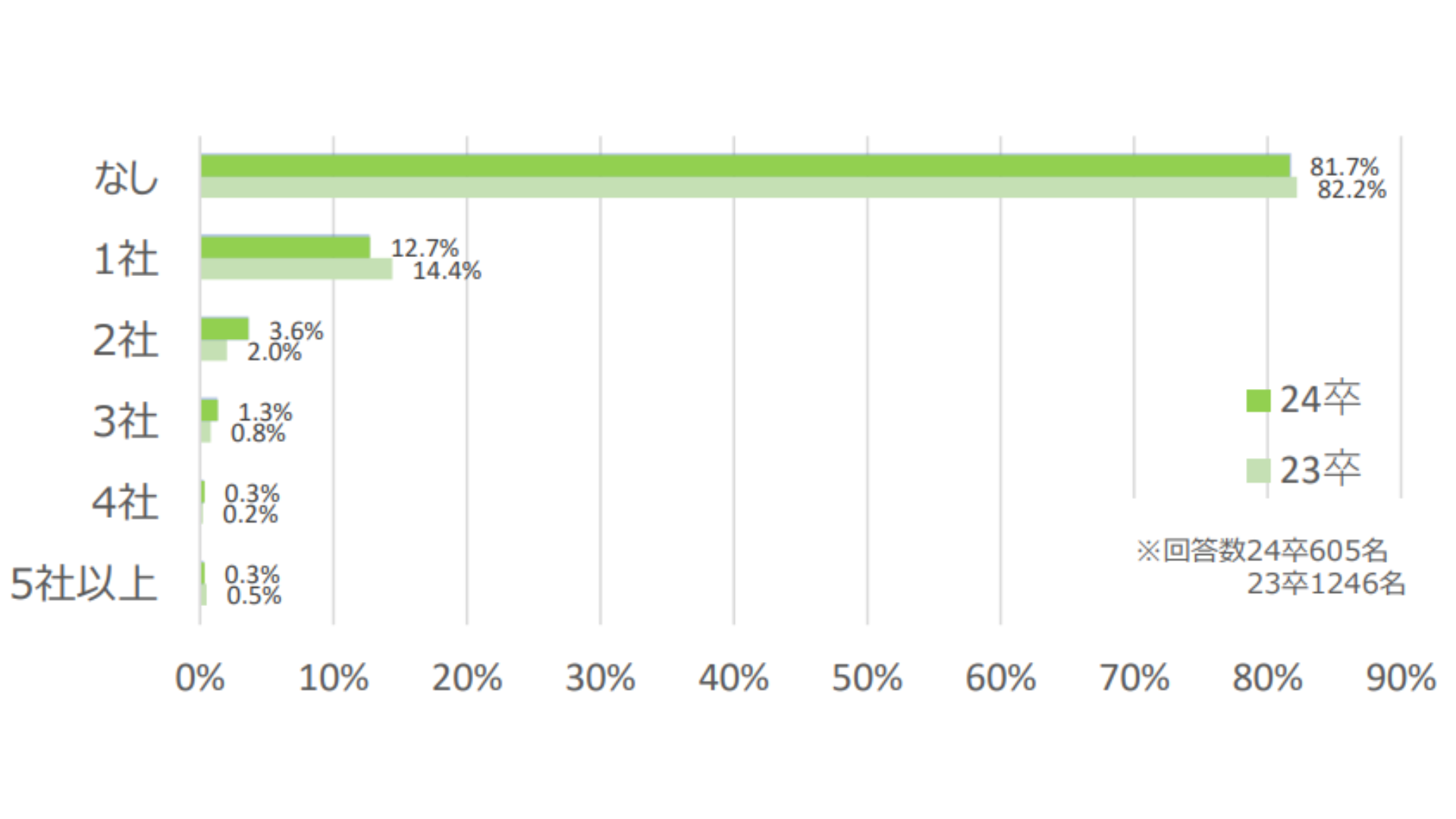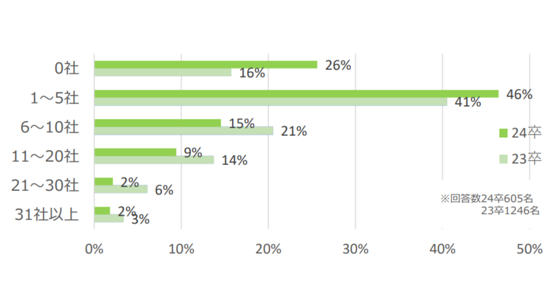 エントリー社数について最も多かったのは【1〜5社】となった。また、エントリーしたことがない学生は23卒よりも増え、全体の26%となった。