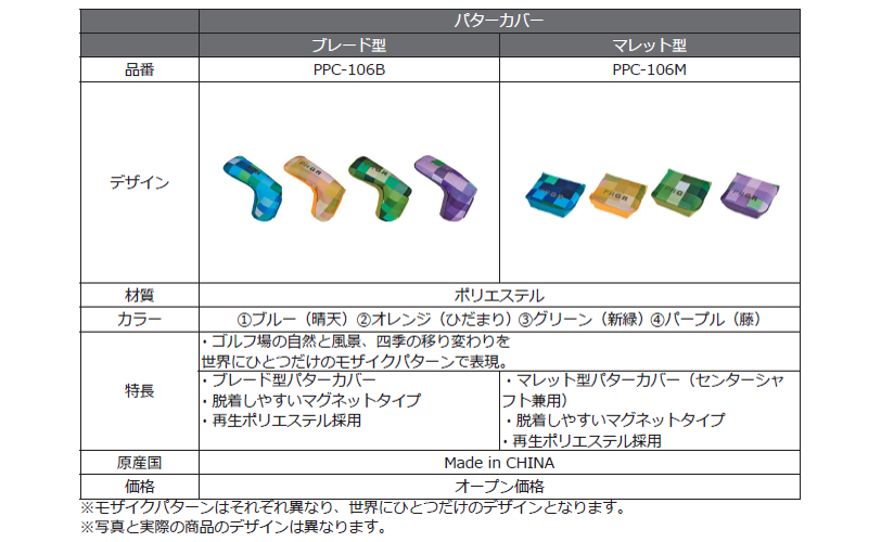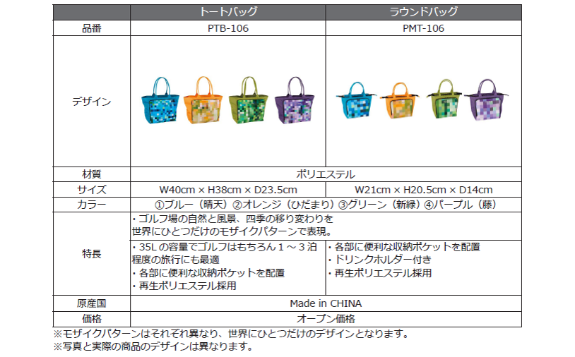 「スタンダードモデル」のカラーはゴルフ場で目にする自然と風景、四季の移り変わりをモザイクパターンで表現したブルー、オレンジ、グリーン、パープルの4色展開。気軽に、身軽に、ゴルフ場に行きたくなるデザインとなっています。