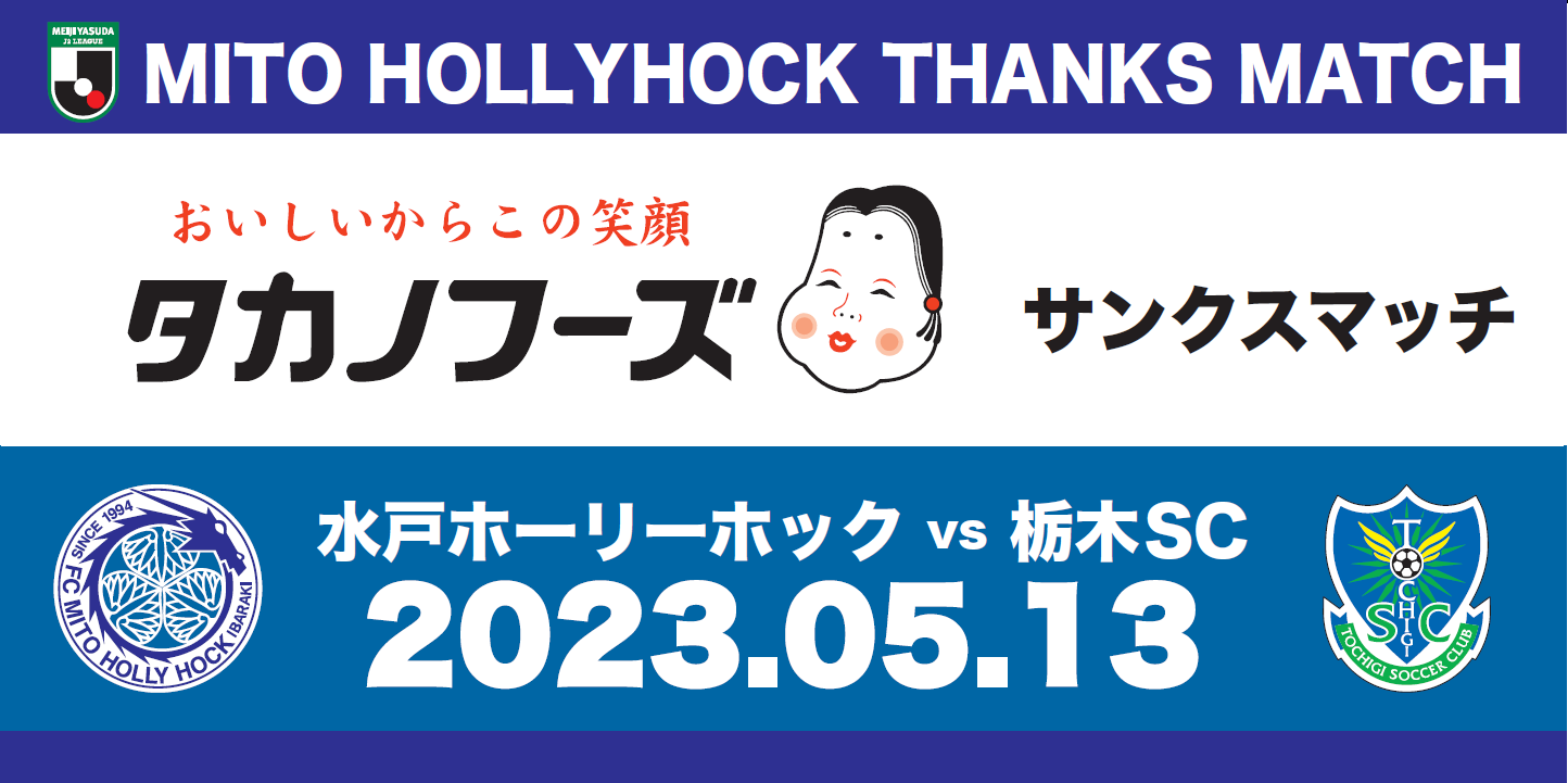 以下 水戸ホーリーホック)は、5月13日(土)に行われる 2023明治安田生命J2リーグ第15節 栃木SC戦を、タカノフーズ株式会社様にサポートいただき『タカノフーズサンクスマッチ』として開催することとなりましたので、下記の通りお知らせいたします。