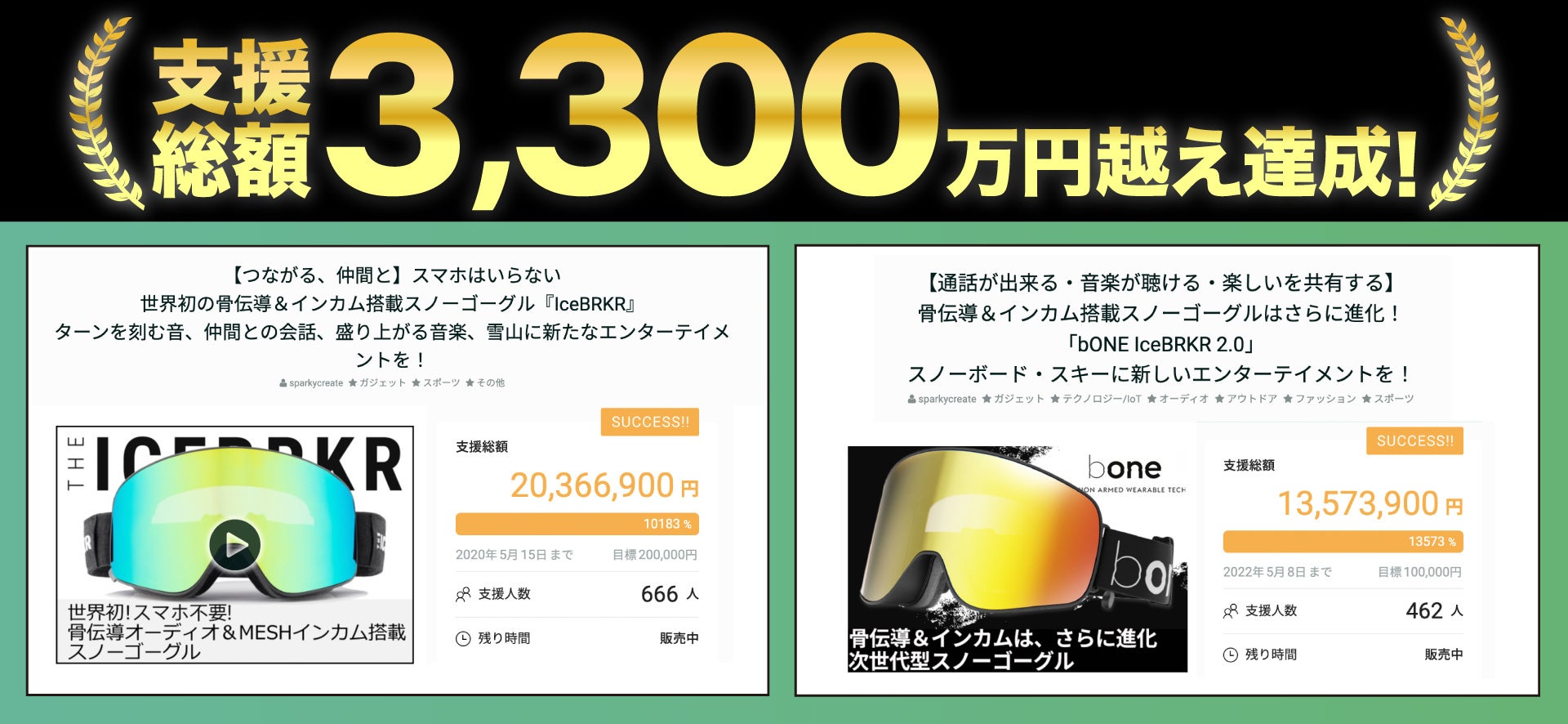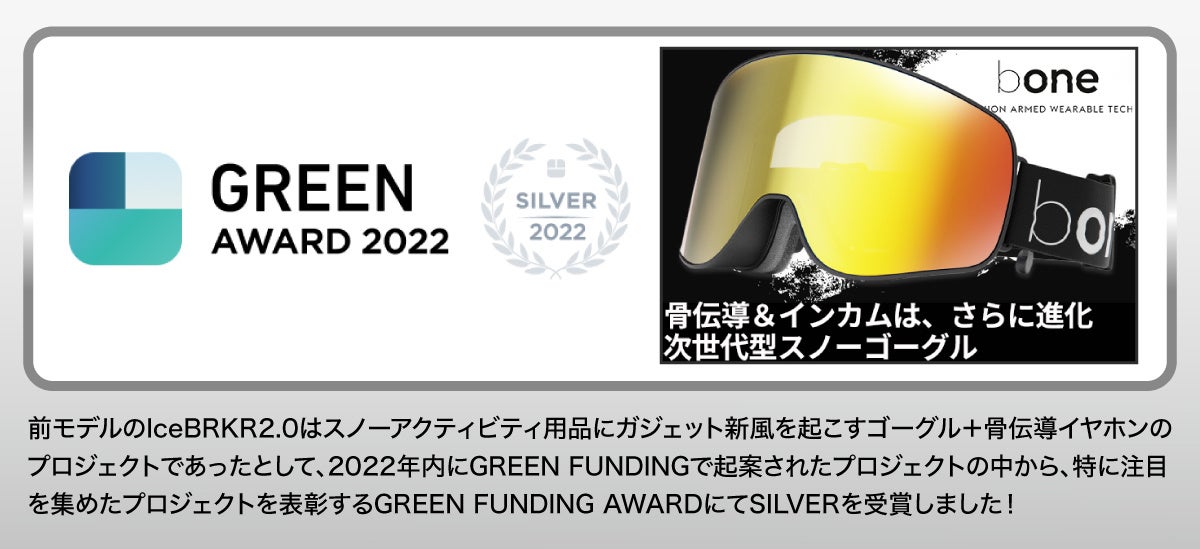 スパーキークリエイト株式会社(本社:東京都足立区、代表取締役:成田 光 以下 スパーキークリエイト)は、bONE Technology社 日本総代理店として、骨伝導イヤホンとBluetoothインカムテクノロジーを搭載したスノーゴーグル『bone』最新モデルの先行販売を国内クラウドファンディングサービスGREENFUNDINGにて2023年4月13日(木)12:00より開始しました。クラウドファンディングではグループでお得な3個セットもご用意、最大38%OFFの特別価格(数量限定)で購入が可能です。