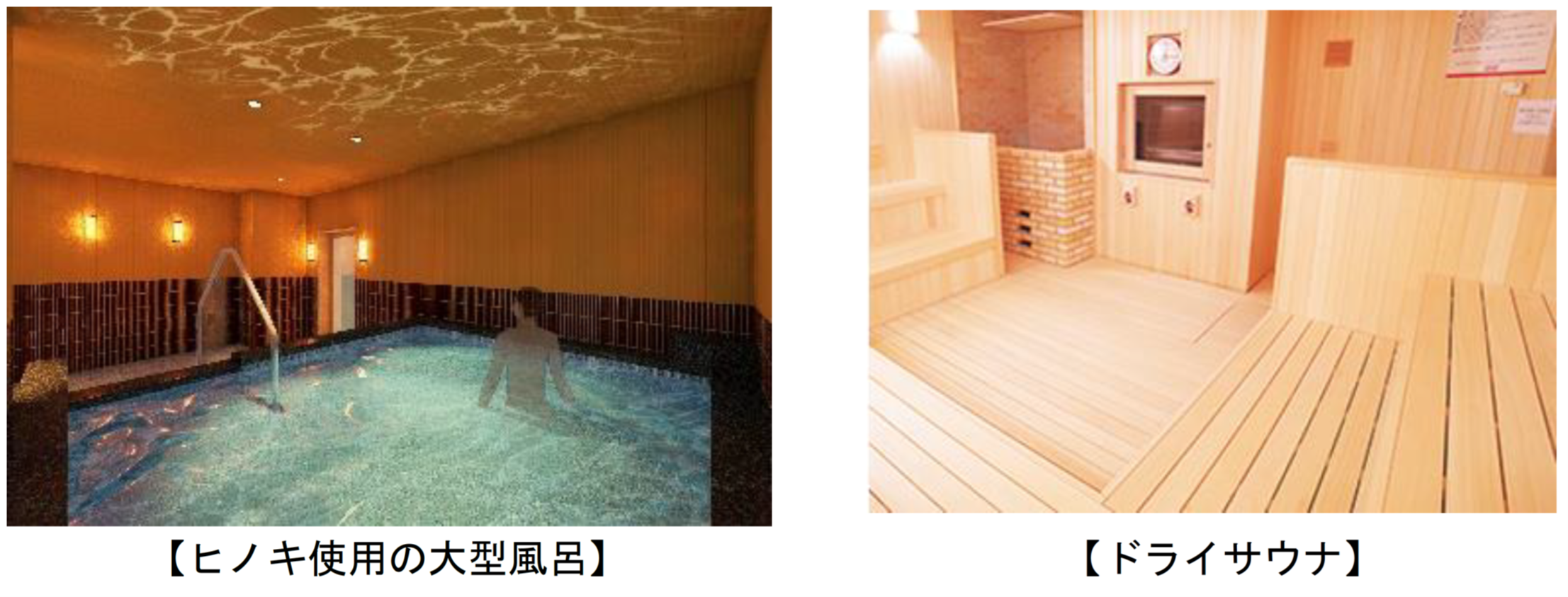 【大型風呂】 日本産ヒノキを使用し、香りや意匠による極上の癒しが味わえます。