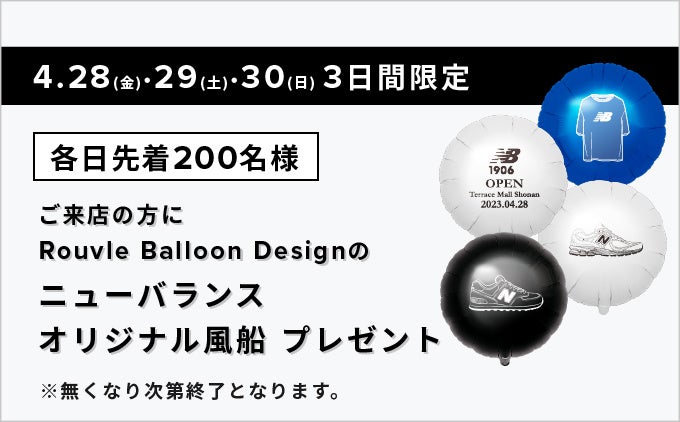 4/28(金)・29(土)・30(日)の3日間限定で、ご来店のお客様にRouvle Balloon Designのニューバランスオリジナル風船を、各日先着200名様にプレゼントいたします。
