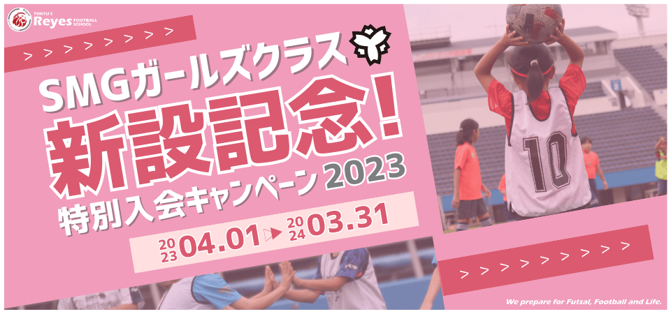 この度、SMGミライ応援プロジェクトの一環として、女子サッカー選手の競技力向上を目的に、日体大SMG横浜(なでしこ1部リーグ所属)と東急SレイエスFC(神奈川県3部リーグ所属)の両者がタッグを組み、たまプラーザ校にて選抜コースSMGガールズクラスの新設いたしました。それに伴い、2023年度に東急Sレイエス フットボールスクールへ入会する女の子限定で入会キャンペーンを実施いたします。つきましては下記をご確認の上、是非ご体験・ご入会ください。皆様のご参加を心よりお待ちしております。