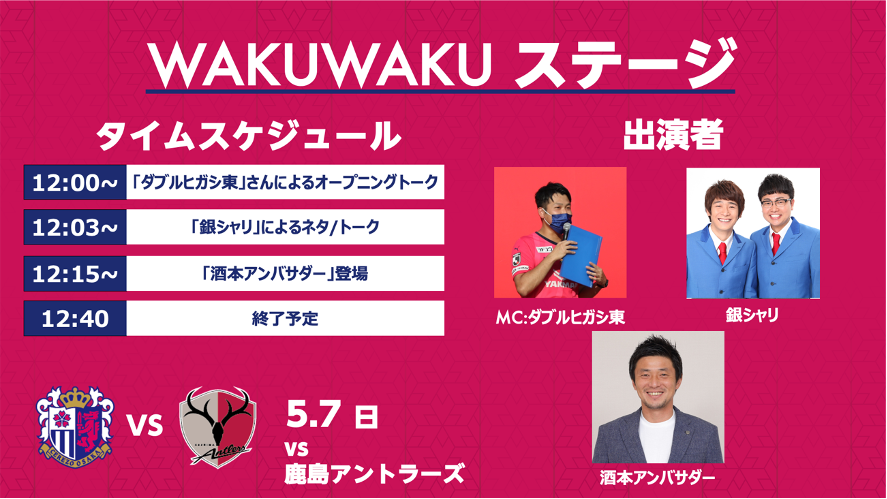 5/7鹿島戦メインMCは吉本セレッソ応援隊で「ytv漫才新人賞決定戦」で見事優勝したダブルヒガシ東 さんとなります。