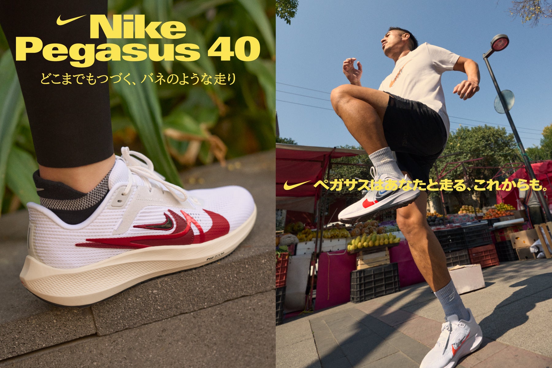 どんなレベルのランナーにも喜ばれる履き心地と、バネのような推進力で、Nikeランニングの中で最も支持を集める定番モデル、それがペガサスです。万人向けのランニングシューズとして40年前に誕生しました。「ナイキ エア ズーム ペガサス 40」は、そんなペガサスの記念すべき40代目となる最新モデルです。4/13(木)に発売された(※1)第1弾に続き、今回は第2弾としてホワイトをベースとした新色が登場しました。