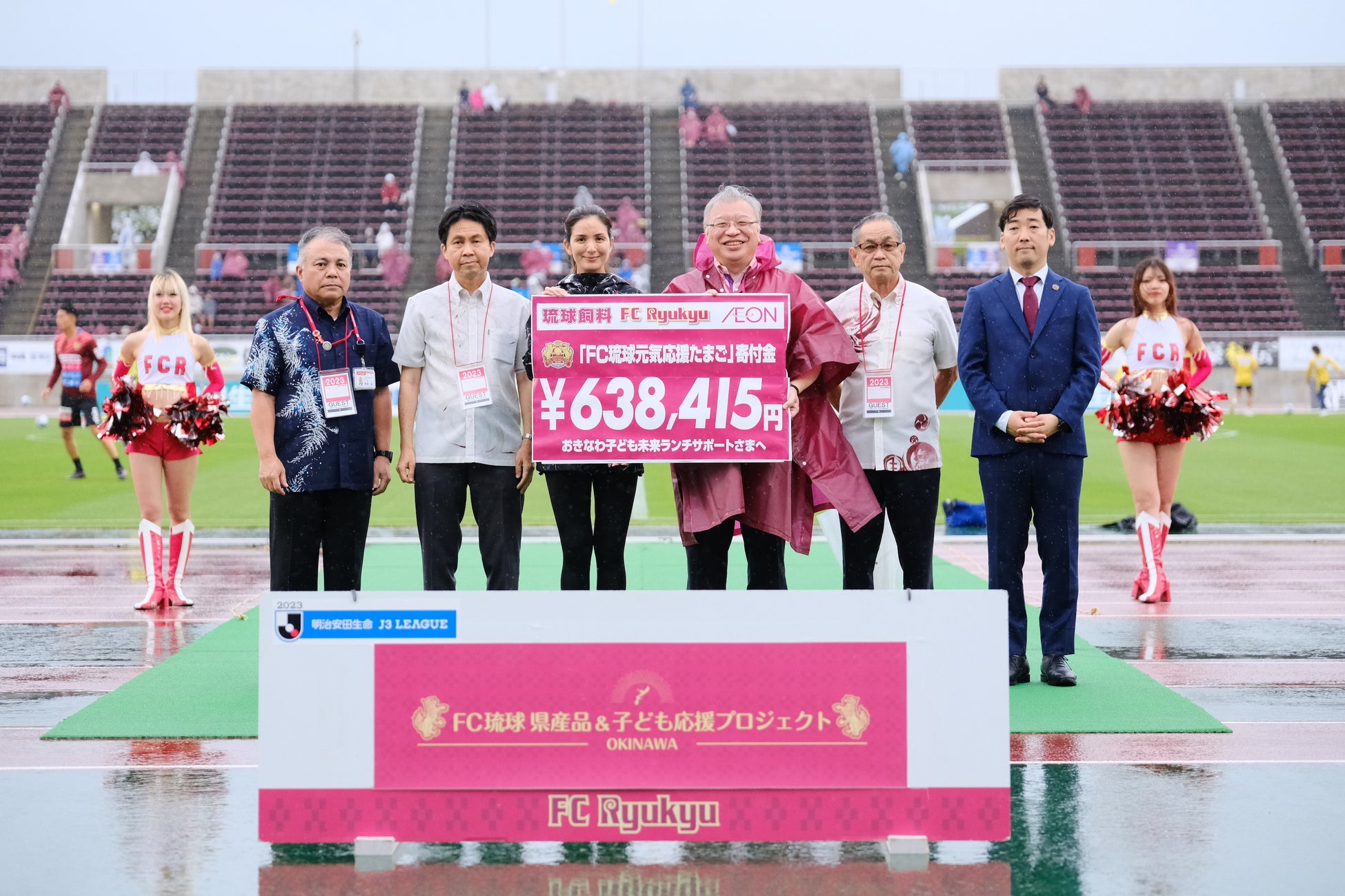 琉球フットボールクラブ株式会社(以下、FC琉球)とイオン琉球株式会社(以下、イオン琉球)、琉球飼料株式会社(以下、琉球飼料)は、FC琉球県産品&子ども応援プロジェクトの一環として、「FC琉球元気応援たまご」(以下、当商品)の売上金額の一部63万8,415円を次世代の子どもたちの支援に活用していただくため、「おきなわこども未来ランチサポート」へ寄付いたしました。