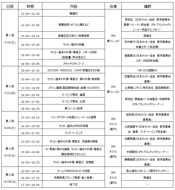 サッカーに関わるアスレティックトレーナーを志す方を対象に、JFAの活動に関わるドクターやアスレティック トレーナーからのセミナー機会を提供し、サッカーの現場における怪我予防、応急処置、コンディショニング等の業務に触れる機会を提供する。