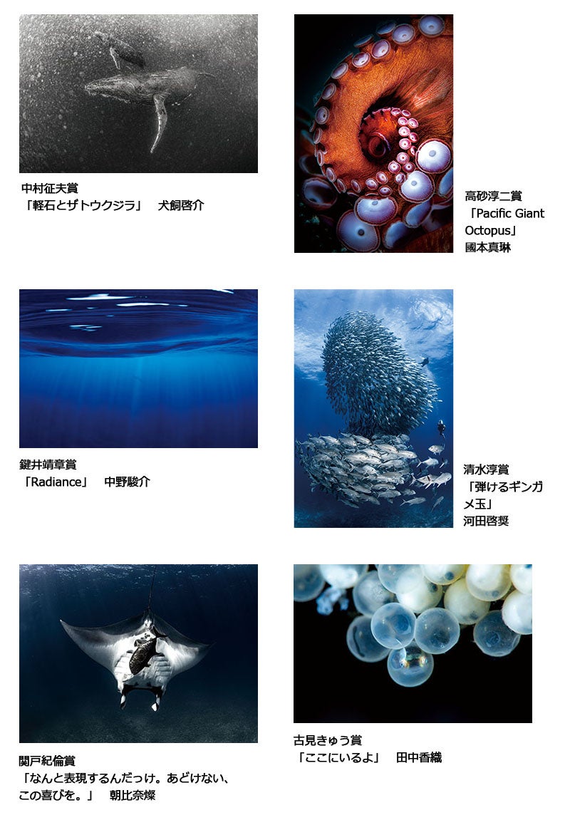 第1回「⽇本⽔中フォトコンテスト」は、2022年11⽉1⽇から応募受付を開始。2023年1⽉10⽇に締め切り、総数2,512点、461⼈の⽅から作品が応募されました。その中から、中村征夫さん、⾼砂淳⼆さん、鍵井靖章さん、清⽔淳さん、関⼾紀倫さん、古⾒きゅうさんの6名の日本を代表する水中写真家の審査により、全25点の入賞作品が選ばれました。