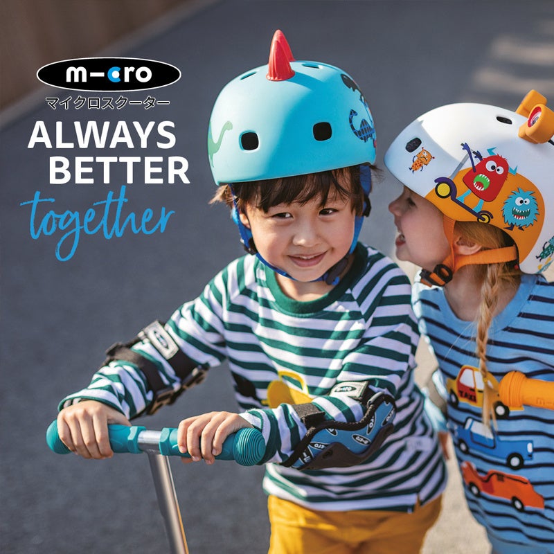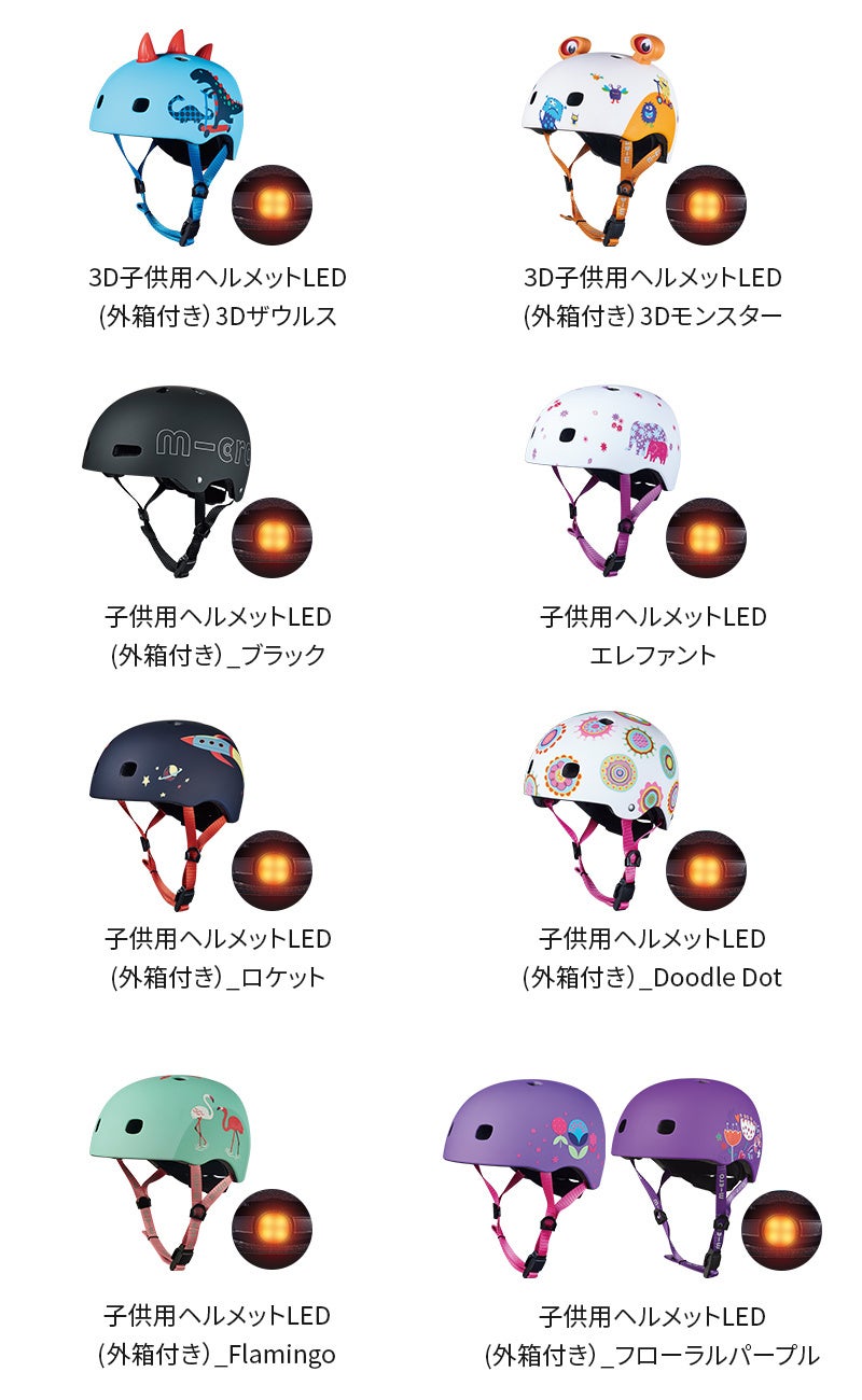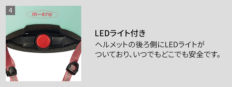 3パターンに変化するLEDライトが装備されており、子供の位置確認が可能なマイクロのヘルメット