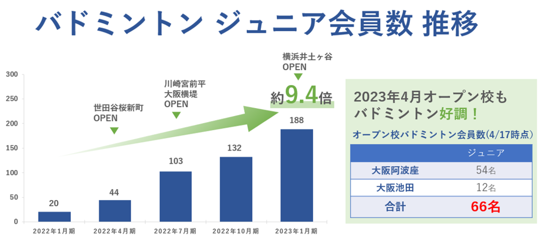 当社は関東・関西を中心にバドミントンスクールを7校展開しています。世界大会で多くの選手が活躍し、パリ五輪でも注目されているバドミントンは、小学生の習い事として人気も高く、2022年1月期ではジュニア会員数が約20名だったところ、この1年で188名となり、約9.4倍増となっています。
