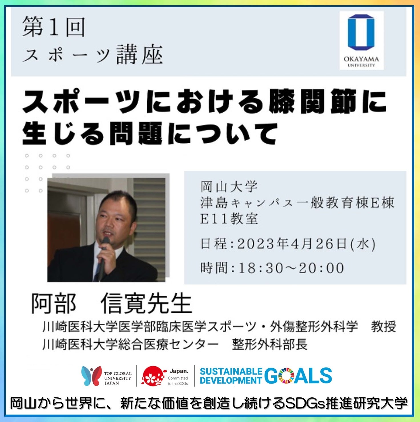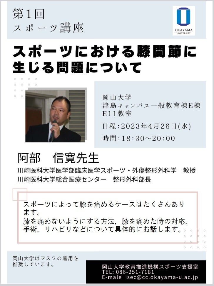 今回、本年度第1回となるスポーツ講座「スポーツにおける膝関節に生じる問題について」を2023年4月26日(水)に岡山大学津島キャンパス(岡山市北区)にて開催します。