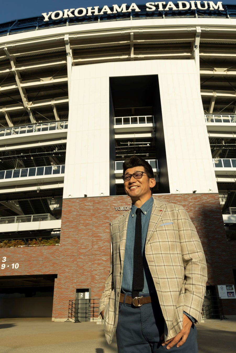 ファッション撮影に参加してくれたのは、佐野恵太選手、伊勢大夢選手、宮國椋丞選手、伊藤光選手、柴田竜拓選手、大田泰示選手、神里和毅選手の7名と三浦大輔監督。三浦監督(写真)は、こなれたチェックのジャケパンスタイルに。