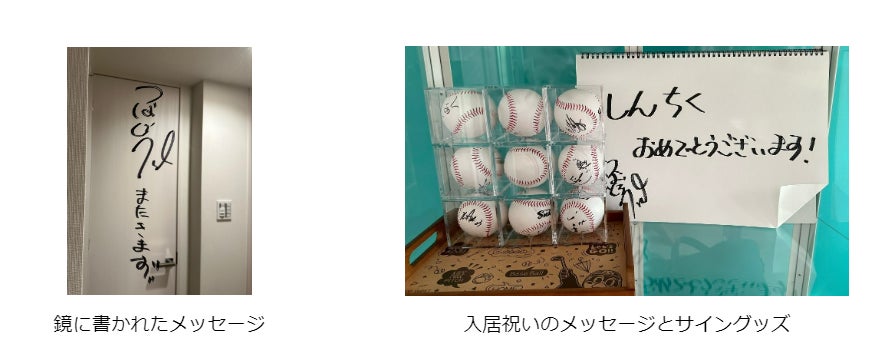 つば九郎の訪問に大感激のK様!つば九郎からは、2023年のシーズンチケットと花束、そしてお祝いのメッセージが贈られました。最後にはK様のご希望で、つば九郎から玄関の鏡にサインとメッセージもプレゼント。K様も「すっかりファンになりました」と終始笑顔のご様子で、とても和やかで温かい入居祝いとなりました。