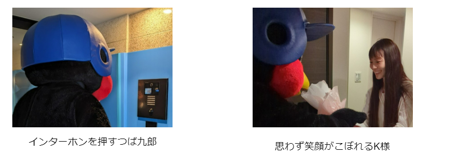つば九郎の訪問に大感激のK様!つば九郎からは、2023年のシーズンチケットと花束、そしてお祝いのメッセージが贈られました。最後にはK様のご希望で、つば九郎から玄関の鏡にサインとメッセージもプレゼント。K様も「すっかりファンになりました」と終始笑顔のご様子で、とても和やかで温かい入居祝いとなりました。