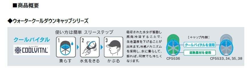 「ウォータークールダウンキャップ」シリーズは、水に濡らして振ることによる水分の蒸発冷却により生地温度を下げる、冷感メカニズム「クールバイタル」※1を採用し、水に濡らして振れば繰り返し冷感効果が得られます。さらに、光触媒生地を 採用したアイテム(CPSG33)や、遮熱素材を採用したアイテム(CPSG36)、キャップの正面裏側に保冷剤ポケットのついたアイテム(CPSG38)など、メンズでスタイル別に5アイテムをご用意しています。