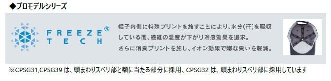 「FREEZE TECH」(フリーズテック)※2シリーズは、キャップ内側に冷感プリントを施すことにより、水分(汗)を吸収することで生地の温度が下がり、冷感効果が得られます。さらに消臭プリント効果で嫌な臭いも軽減します。プロモデルとして、メンズ2アイテム、レディス1アイテムをご用意しています。