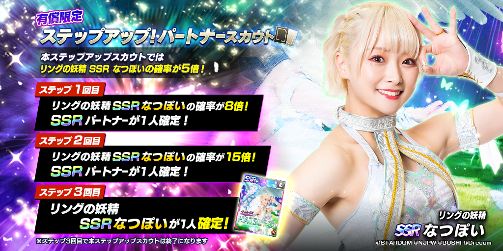 - スターダムから、SSRパートナーとしてなつぽいが初登場!STARDOM限定ステップアップパートナースカウトを開催!