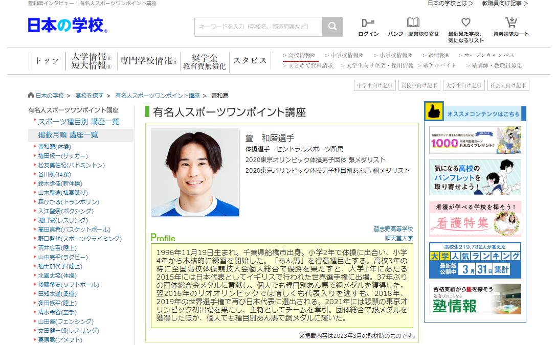全国の大学・短大・専門学校などの学校情報を提供する、株式会社JSコーポレーション(本社:大阪市北区 代表取締役社長:米田英一)は、スポーツワンポイント講座「体操/萱和磨選手」(https://school.js88.com/scl_h/onepoint-advice/sport?item=15&athlete=208)」を公開しました。