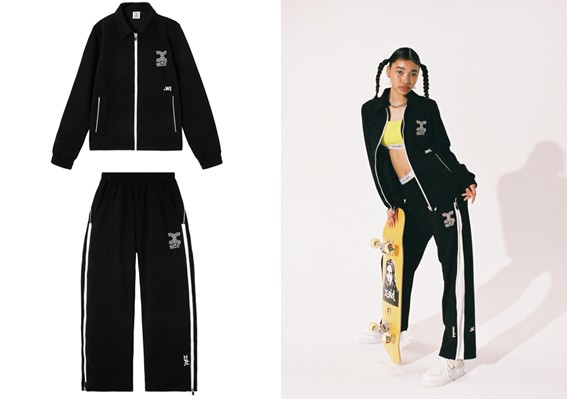 シルエットはゆったりとしたトラックジャケット。袖のラインテープは、本コラボコレクションの象徴的なグラフィックがプリントされています。