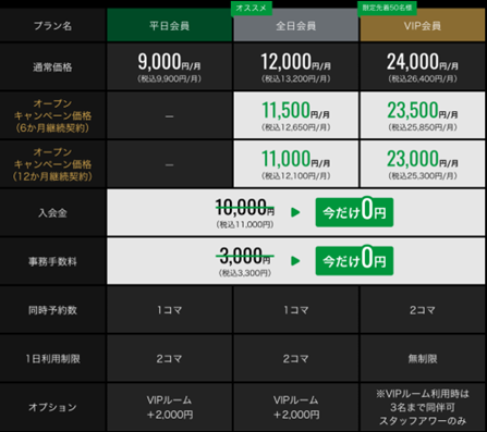 月9,900円から通える平日会員プランを含む3種類のプランをご用意!あなたの目的やニーズに合わせてお好きなプランをお選びいただけます。現在月会費永久割を含む4大特典がもらえるお得なオープン前最終キャンペーン中!(5/9まで)キャンペーン詳細はHPをご確認ください。