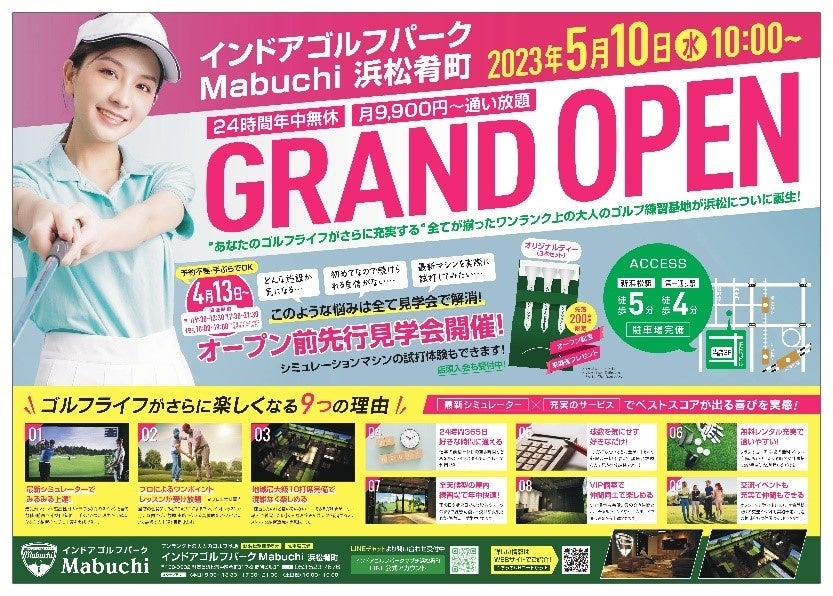 間渕商店グループ(本社 静岡県浜松市 代表 間渕 亨夫)は2023年5月10日10時より24時間年中無休で楽しめるインドアゴルフ練習場「インドアゴルフパークMabuchi浜松肴町」を新規オープンいたします。