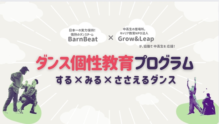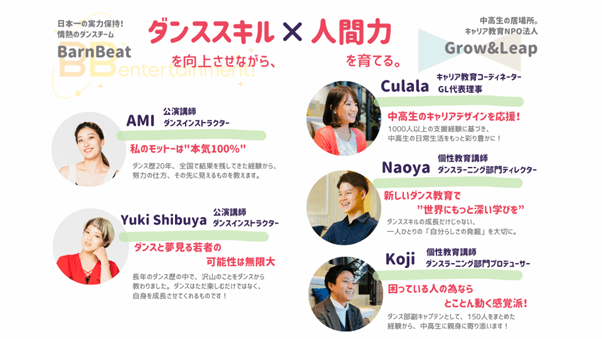 人間性×ダンススキルの向上を同時に図っていくことを目標に、Grow&LeapとBarnBeatが役割分担しながら連携し、一人ひとりにじっくりと向き合いながら、苦手なところを一緒に克服し、良いところはもっと成長できるようにサポートしています。