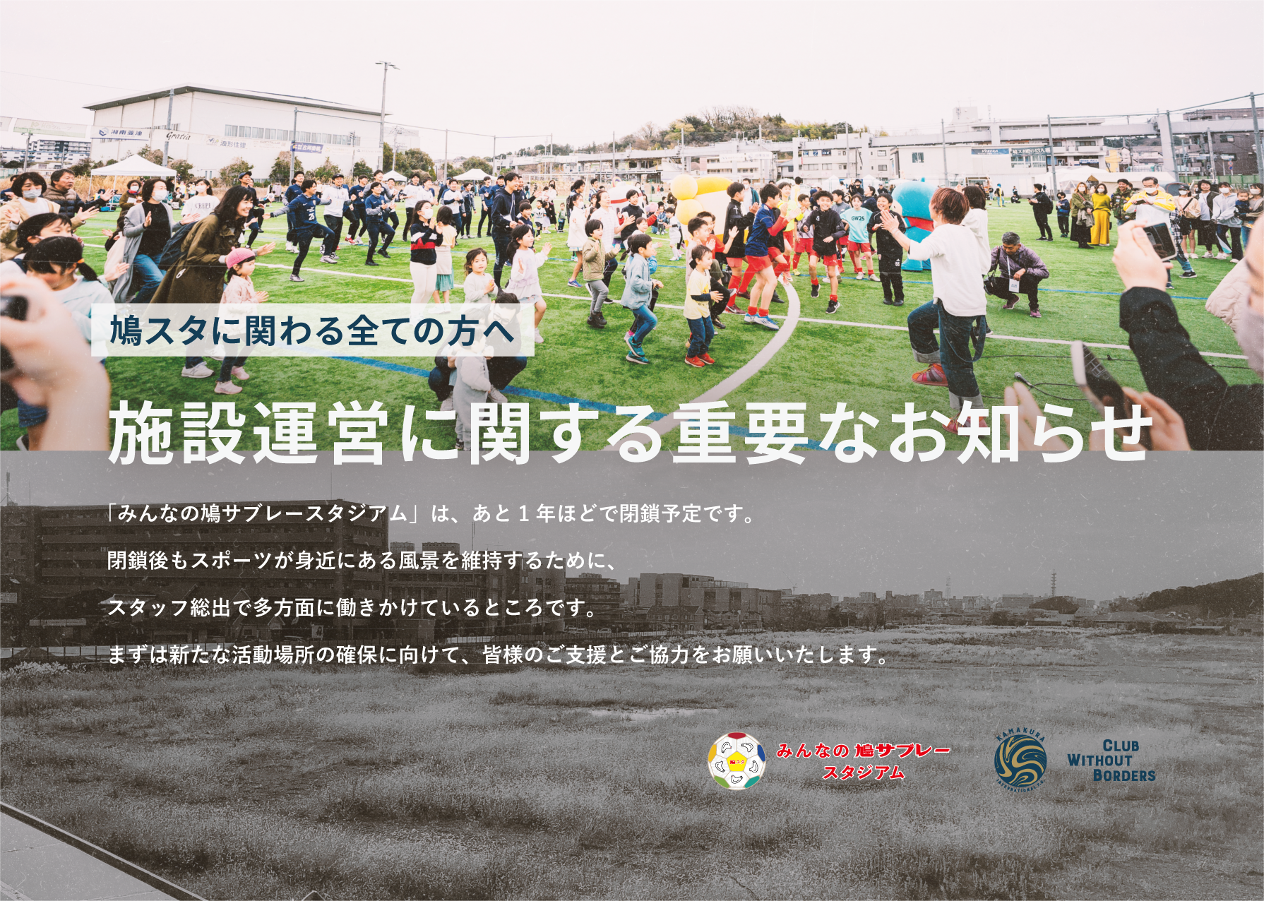 鳩スタがこれまで産み出してきた地域のにぎわい、そしてスポーツが身近にある生活を絶やすことなく次世代につなげたい。