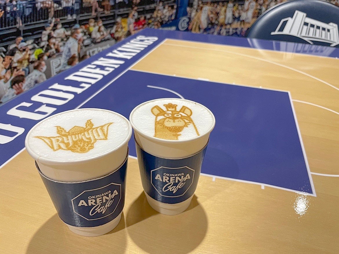 「アリーナカフェ」では、沖縄市から、焙煎の技術を競う世界大会(WCRC)で準優勝した豆ポレポレのオーナー仲村氏が手掛けたスペシャリティーコーヒーの「アリーナブレンド」、世界三大紅茶に並ぶ第四の紅茶と評される「琉球紅茶」、さらに、キングスの選手をラテアートした「プリントラテ」などをご賞味いただけます。