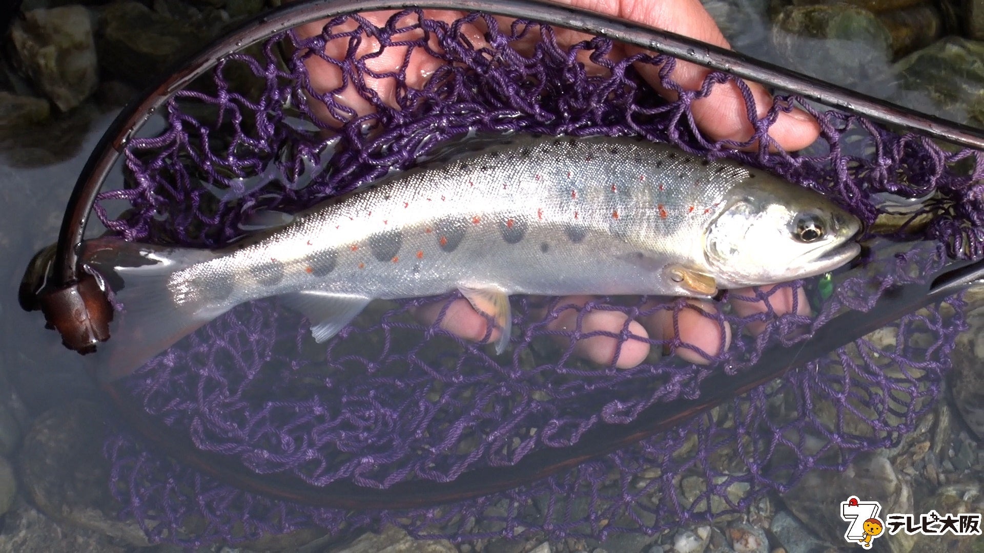 地形の特徴、水流の速さ、アマゴの習性を汲み取り、川のどのポイントへルアーをキャストしたら良いかを瞬時に判断しキャスト。一投目、いきなりルアーを追いかけてくる魚をカメラが捉えた。アマゴだ!