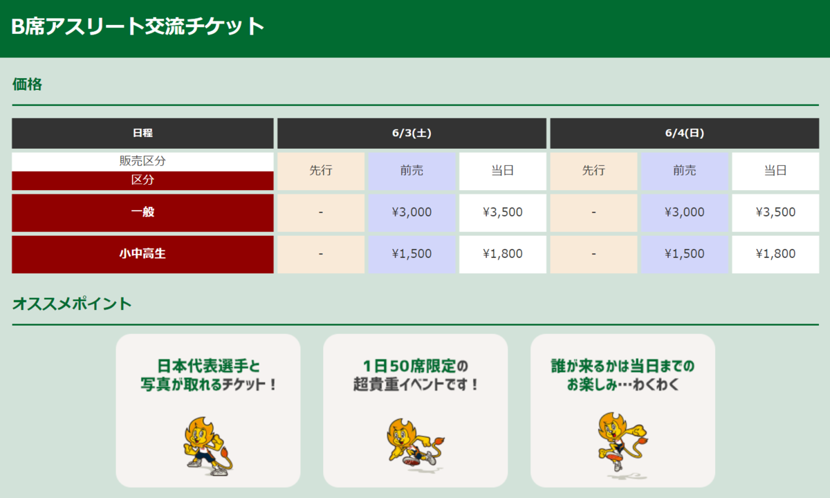 今年はスペシャルチケットとして、テーブル・コンセント付きの最上位グレード席となる「SS席」のほか、1日50席限定の「B席アスリート交流チケット」、1日15席限定の「カメラ女子席」、そして日本選手権では初めてサブトラックの観戦ができる「サブトラック観戦チケット」の販売をいたします。席数限定の販売となりますので、是非お早めにお買い求めください!