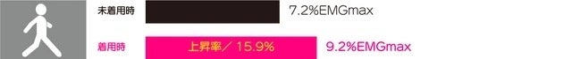 ②早歩きでのウォーキングスピード(6km/h)未着用時:7.2%EMGmax ⇒ 着用時:9.2%EMGmax 上昇率:15.9%