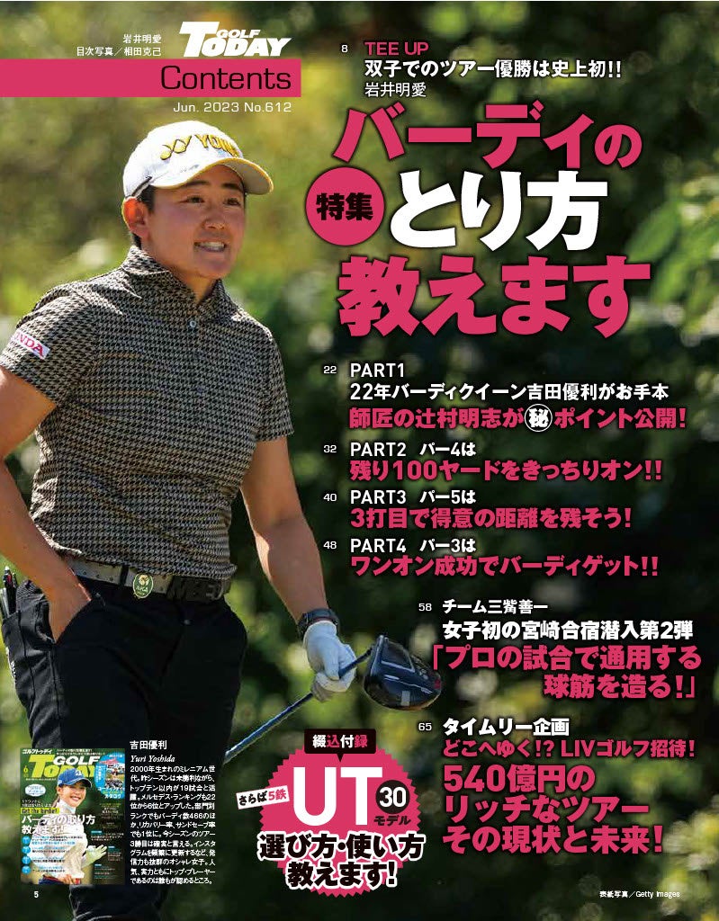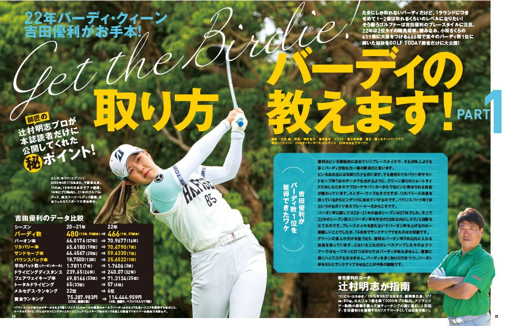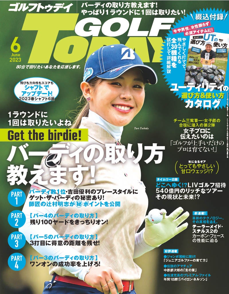 巻頭特集は初の試みとして、アマチュアでは出しにくい憧れのバーディの取り方の大特集。パート1は昨年の日本女子ツアーで最も多くバーディを奪取した吉田優利プロをピックアップ。彼女の師匠である辻村明志にその秘密を詳細に語ってもらった。さらにパー4、パー5、パー3といった違った攻め方をしなければならないそれぞれのホールの、バーディの取り方を解説。