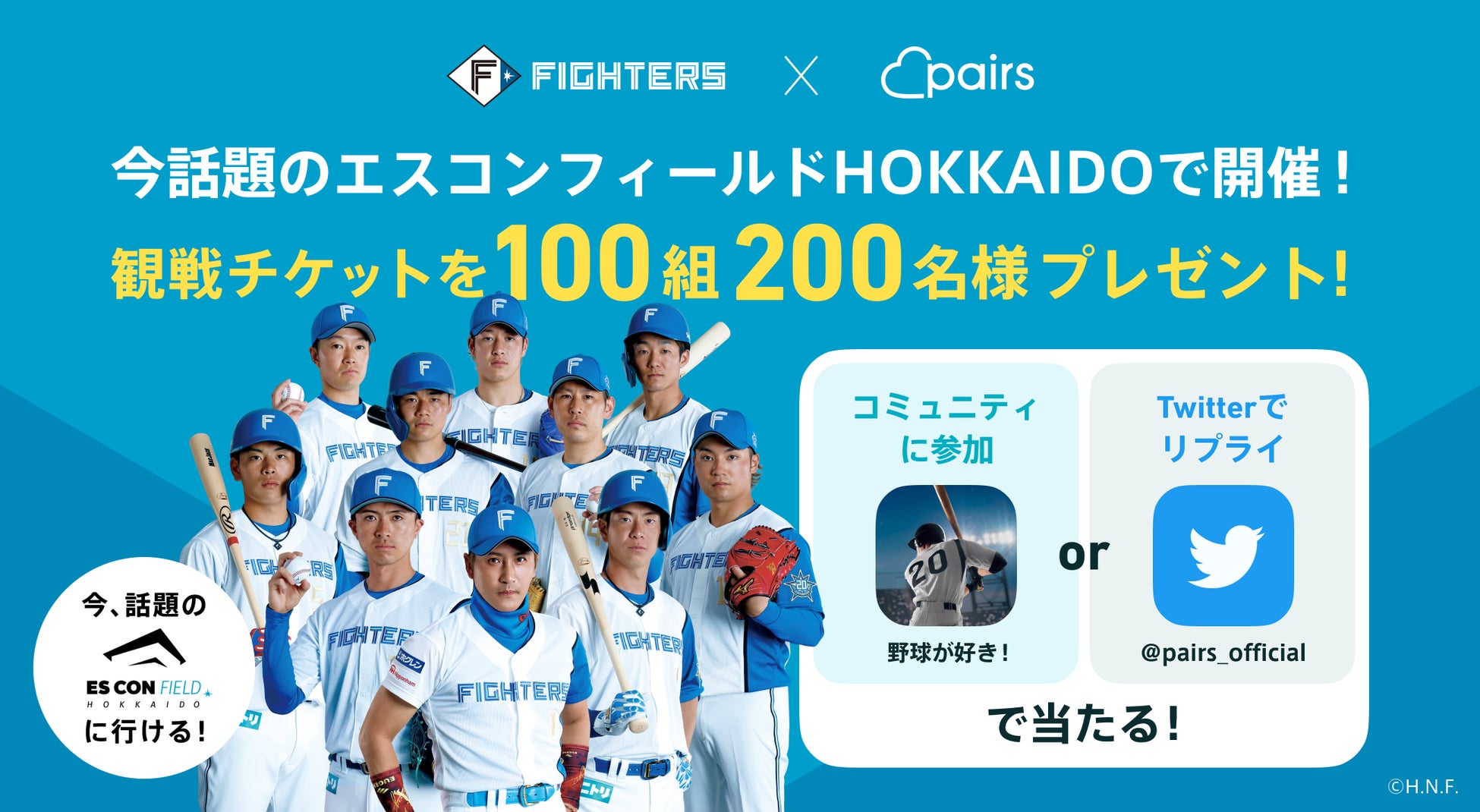 そこでペアーズでは、期待が高まるイベントデートのサポートとして、男女問わず人気を誇り世界大会の優勝でさらに注目される野球をテーマに、北海道日本ハムファイターズと初のコラボレーションを実施。本コラボレーションを記念し、Twitterでのフォロー&返信、またはペアーズアプリ内からご応募いただいた方から合計100組200名様に、話題の新球場「エスコンフィールドHOKKAIDO」で開催される全6日程の試合観戦ペアチケットをプレゼントいたします。