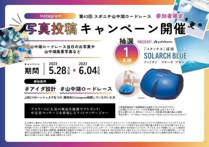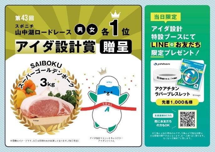 今回アイダ設計は、第43回 スポニチ山中湖ロードレースに協賛し、ハーフマラソンと山中湖一周の男女優勝者計4名への副賞の贈呈と、来場者のみ応募ができる2つのSNSイベントを実施します。Instagram写真投稿キャンペーンでは、大会当日のお写真や山中湖風景のお写真を「#アイダ設計」「#山中湖ロードレース」という2種類のハッシュタグをつけてインスタグラムで投稿すると抽選で1名様に豪華プレゼントが当たるキャンペーンです。また、アイダ設計のLINE公式アカウントとお友だち登録すると、大会当日のアイダ設計ブースで先着1,000名に「アクアチタン ラバーブレス」をプレゼントします。詳しくは当日のアイダ設計ブースでご確認ください。