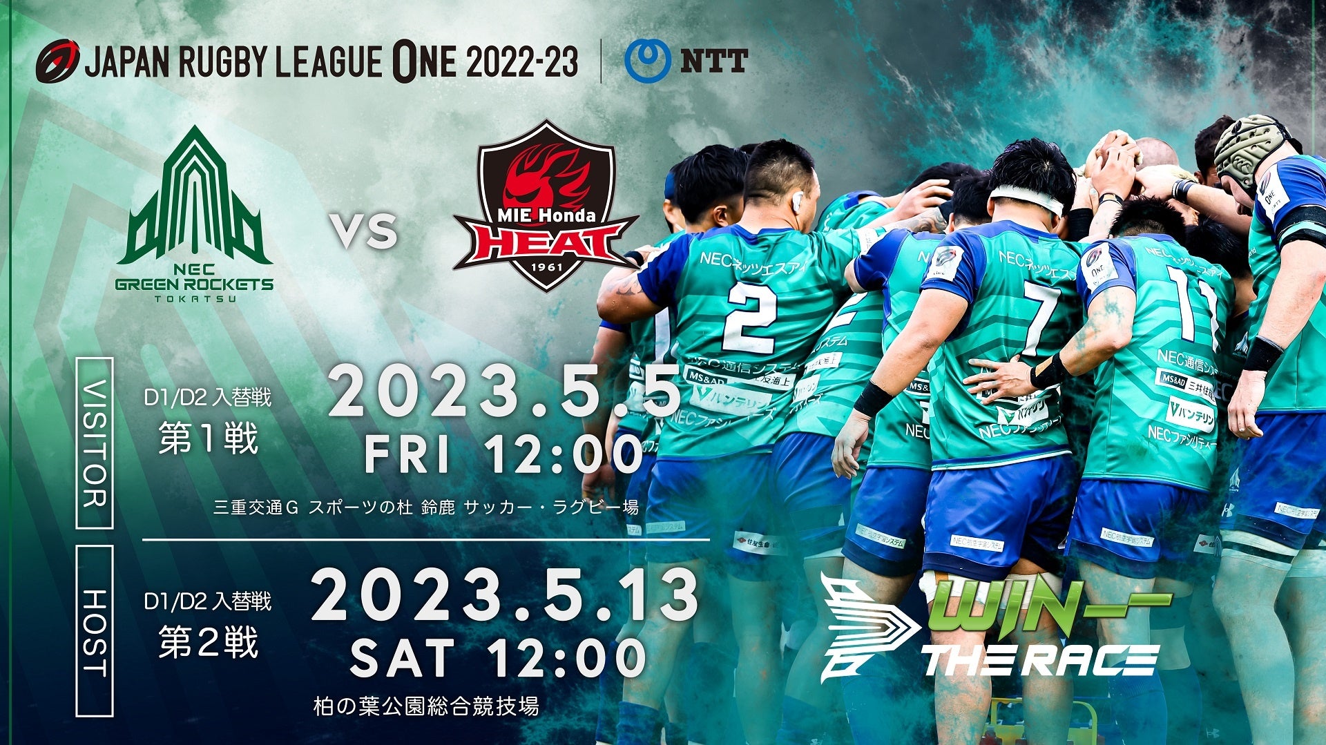 5/13(土) NTTジャパンラグビーリーグワン 2022-23 D1/D2入替戦 第2戦 、ディビジョン2・2位の三重ホンダヒートと対戦します。