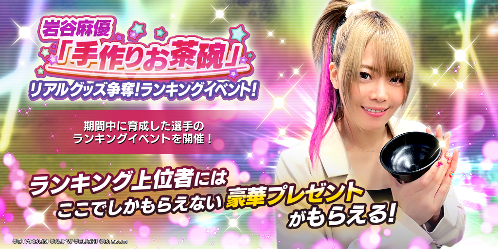 新日SSは2023年5月10日(水)メンテナンス終了後から、岩谷麻優「手作りお茶碗」リアルグッズ争奪!ランキングイベントを開催しています。