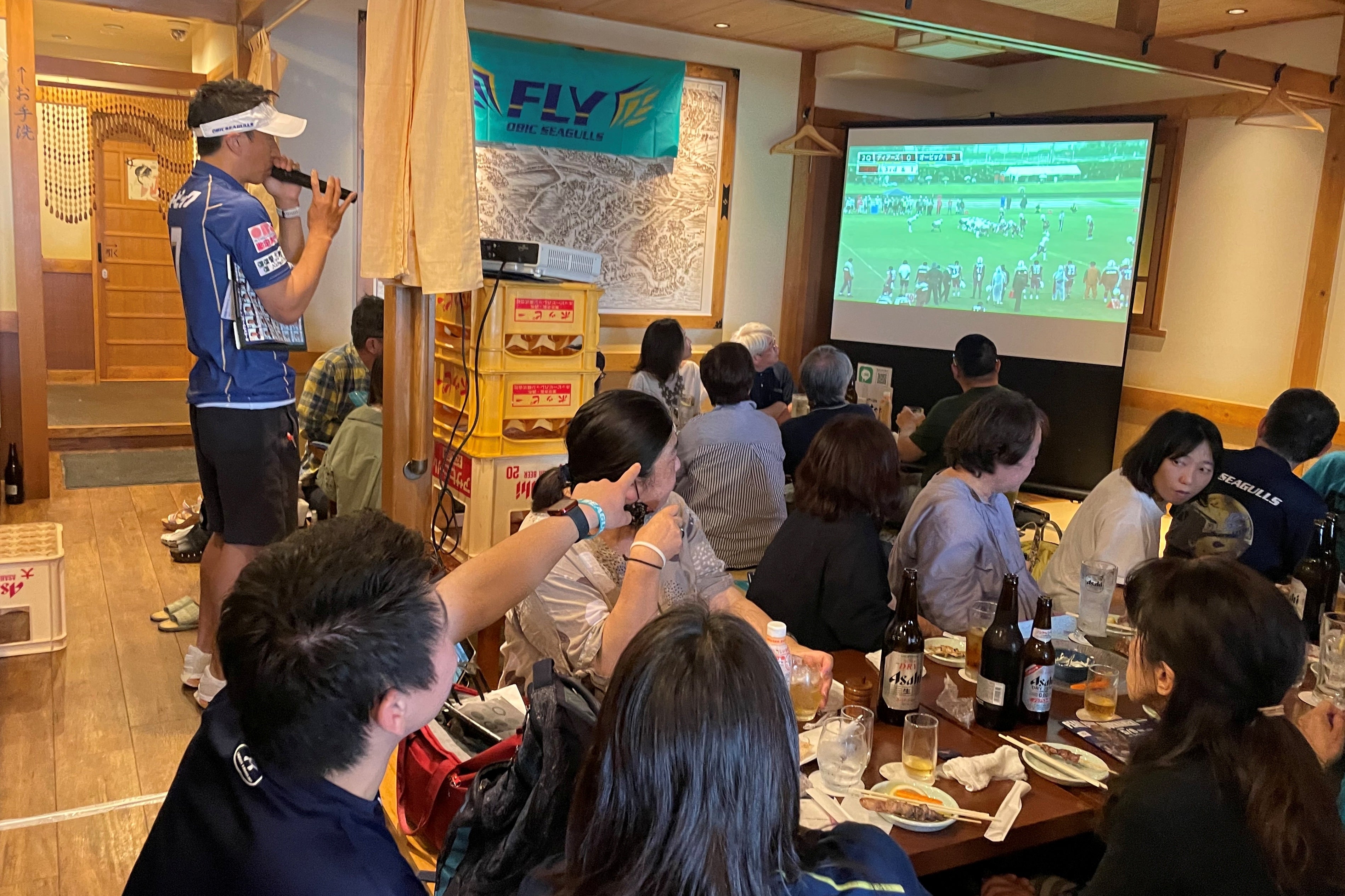 会場は長年チームを応援してくださっている「庄や 京成津田沼店」で、2階を貸し切ってスクリーンとモニターを持ち込み、大画面で観戦していただきました。募集定員いっぱいの40名の方が集まり、軽食とアルコール付き飲み放題を楽しみながらの参戦となりました。