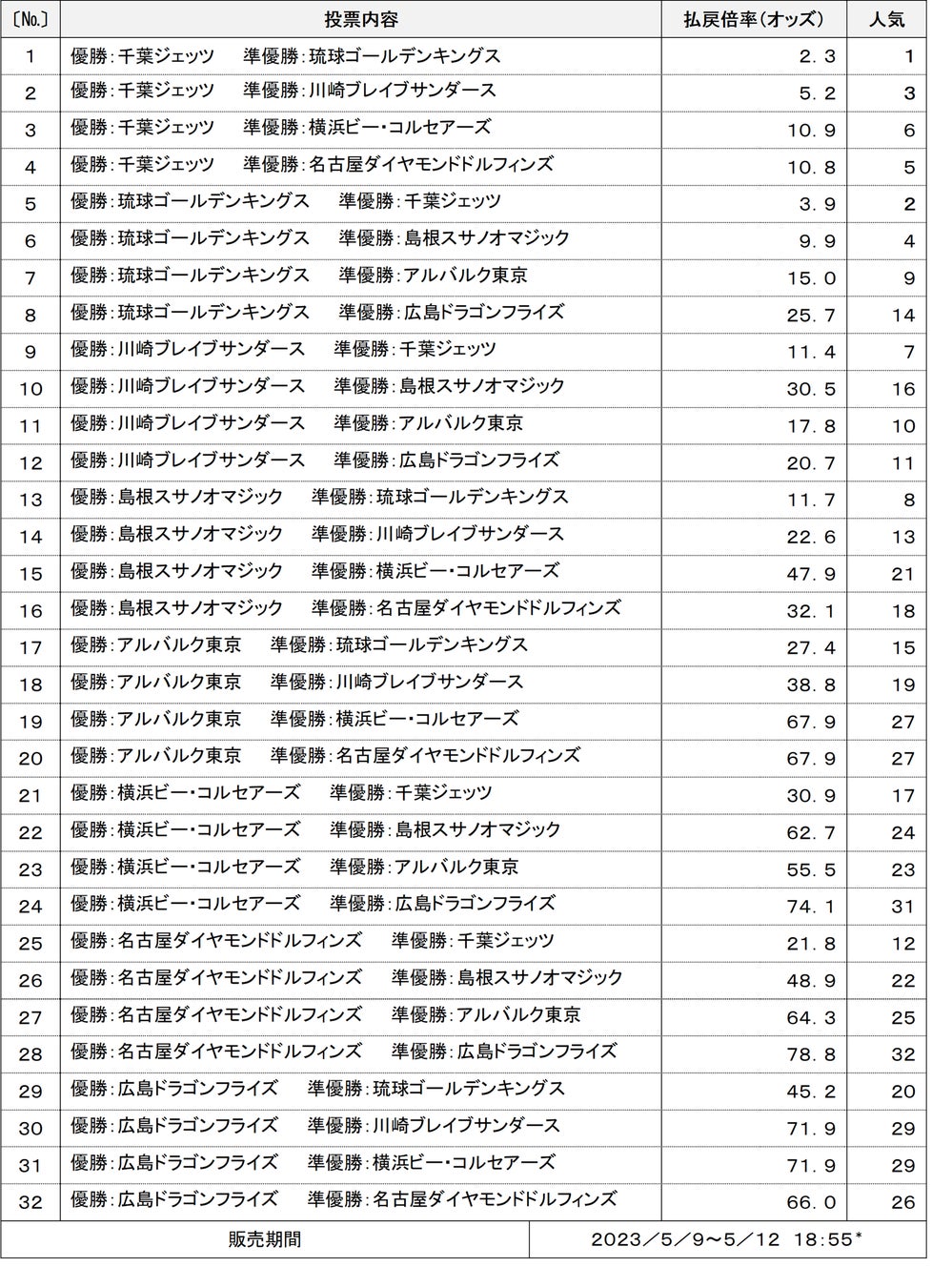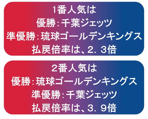 優勝・準優勝予想の1番人気は、優勝が東地区1位で歴代最高勝率を記録したレギュラーシーズン勝率88.3%の千葉ジェッツ、準優勝が西地区1位で同勝率80%の琉球ゴールデンキングスで、払戻倍率(オッズ)は2.3倍!2番人気は、優勝が琉球ゴールデンキングス、準優勝が千葉ジェッツで、払戻倍率(オッズ)は3.9倍、3番人気は、優勝が千葉ジェッツ、準優勝が中地区1位で同勝率66.7%の川崎ブレイブサンダースで、払戻倍率(オッズ)は5.2倍、となっています。