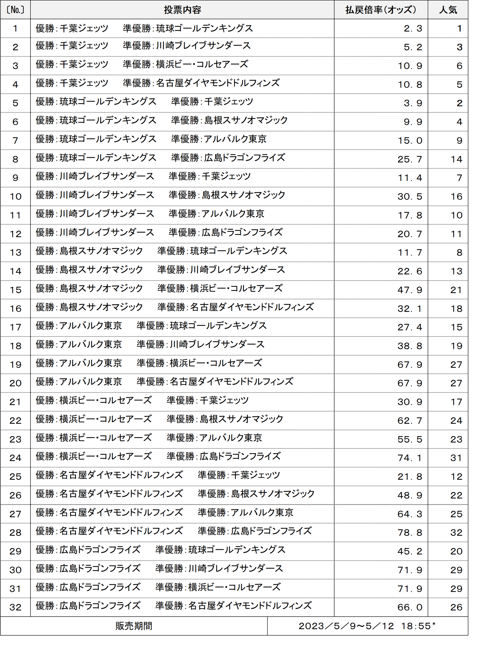 優勝・準優勝予想の1番人気は、優勝が東地区1位で歴代最高勝率を記録したレギュラーシーズン勝率88.3%の千葉ジェッツ、準優勝が西地区1位で同勝率80%の琉球ゴールデンキングスで、払戻倍率(オッズ)は2.3倍!2番人気は、優勝が琉球ゴールデンキングス、準優勝が千葉ジェッツで、払戻倍率(オッズ)は3.9倍、3番人気は、優勝が千葉ジェッツ、準優勝が中地区1位で同勝率66.7%の川崎ブレイブサンダースで、払戻倍率(オッズ)は5.2倍、となっています。