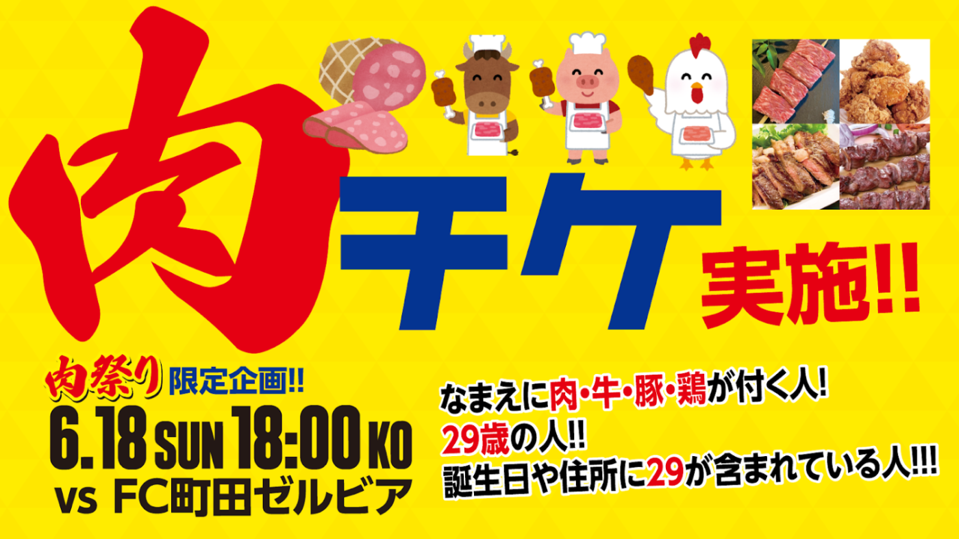 6月18日(日)町田戦は”肉祭り”ということで「肉チケ」無料ペア招待キャンペーンを実施いたします。