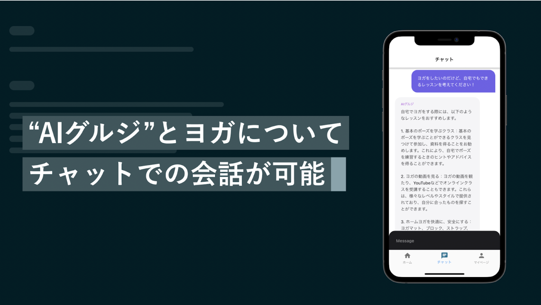 昨今話題となっているOpenAI社が提供する対話型AI「ChatGPT」を活用し、”AIグルジ”とチャット形式で会話をすることが可能となりました。”AIグルジ”がヨガに関することについて教えてくれます。ヨガに関する会話がメインとなっております。ホームにあるポーズに関することもチャットで詳しく質問することができるので、自分の知りたいヨガの知識を深めることができます。