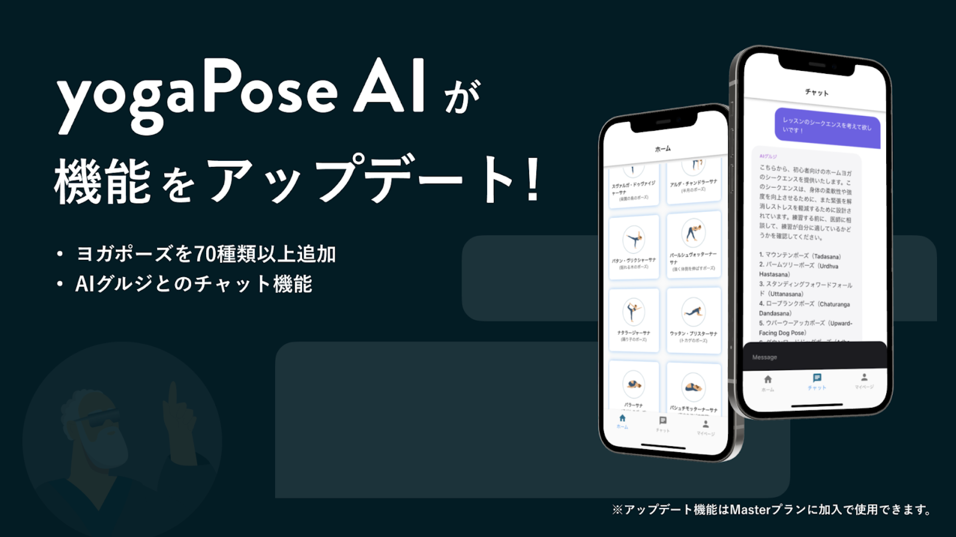 『yogaPose AI(ヨガポーズAI)』では、5月11日よりプレミアムプランとして 「Master プラン」を追加しました。「Master プラン」では70種類以上のヨガポーズを効率良く見つけることができ、チャット形式でヨガに関することAI師匠に相談することが可能になります。