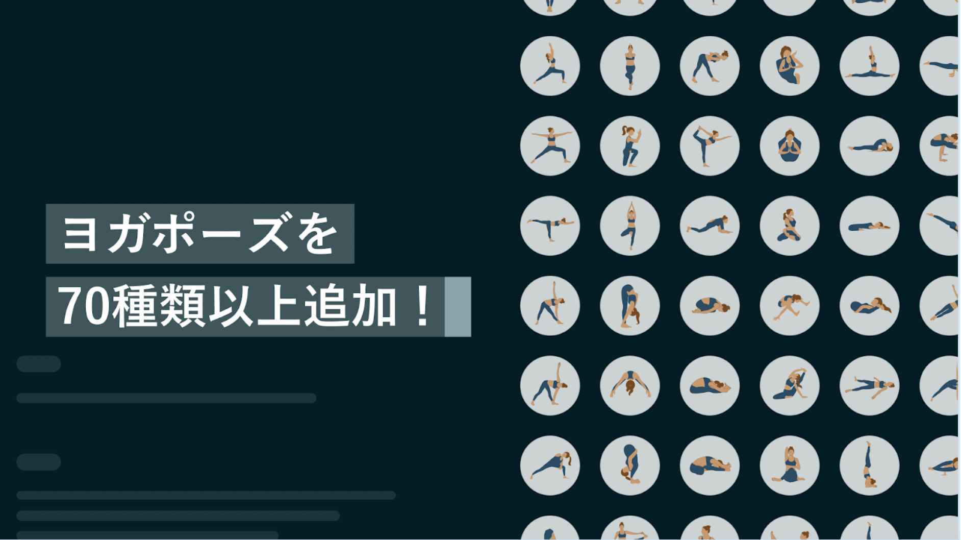 ヨガポーズの種類をさらに増やし、レッスンでよく使うポーズからプロ向けのポーズなど厳選した70種類以上を追加しました。ホーム画面にはポーズのアイコンが並んでおり、一目でどのポーズかも確認することができます。ポーズ名もサンスクリット語と日本語で表示しています。
