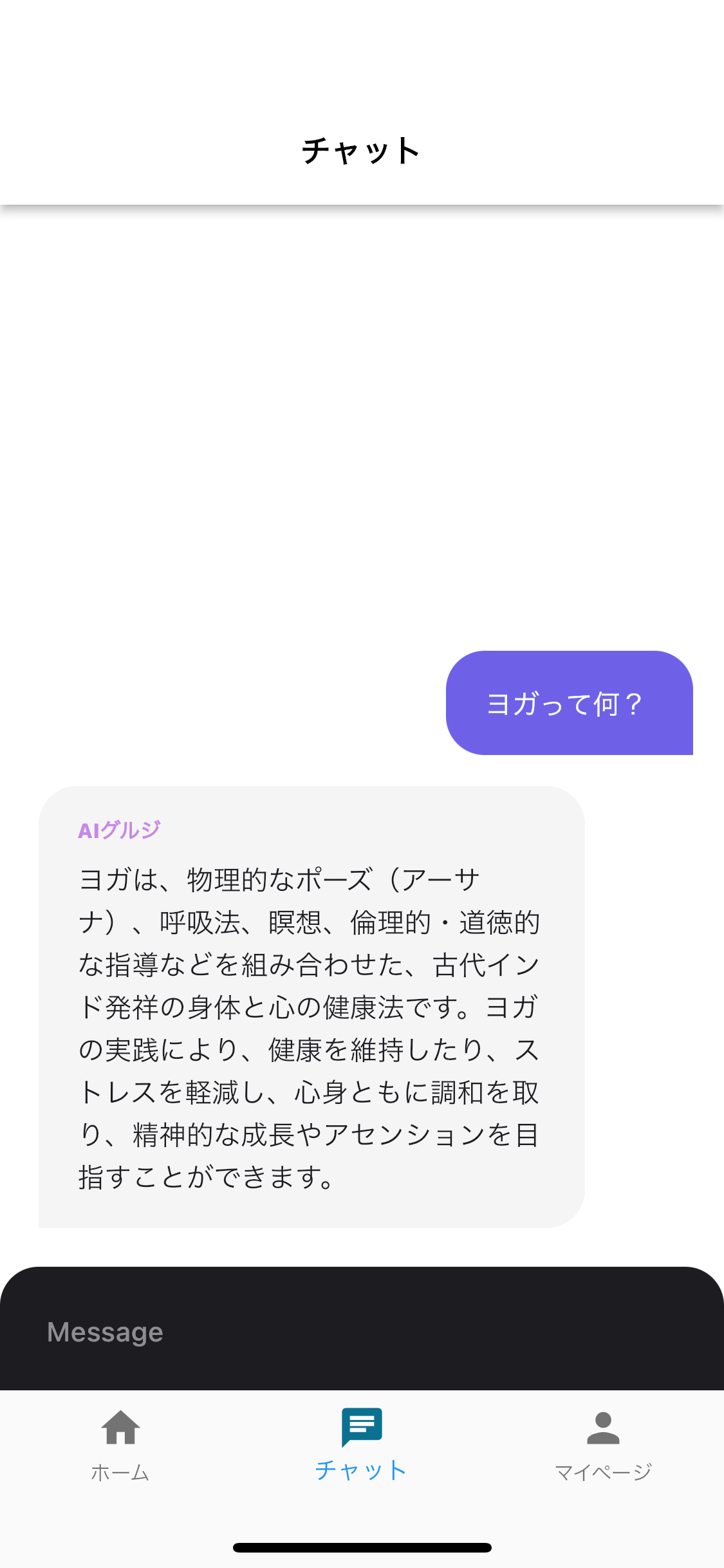 Guruji(グルジ)は師匠や師という意味です。本アプリのチャットでは”AIグルジ”としてヨガに関する質問などの回答をチャットで行います。