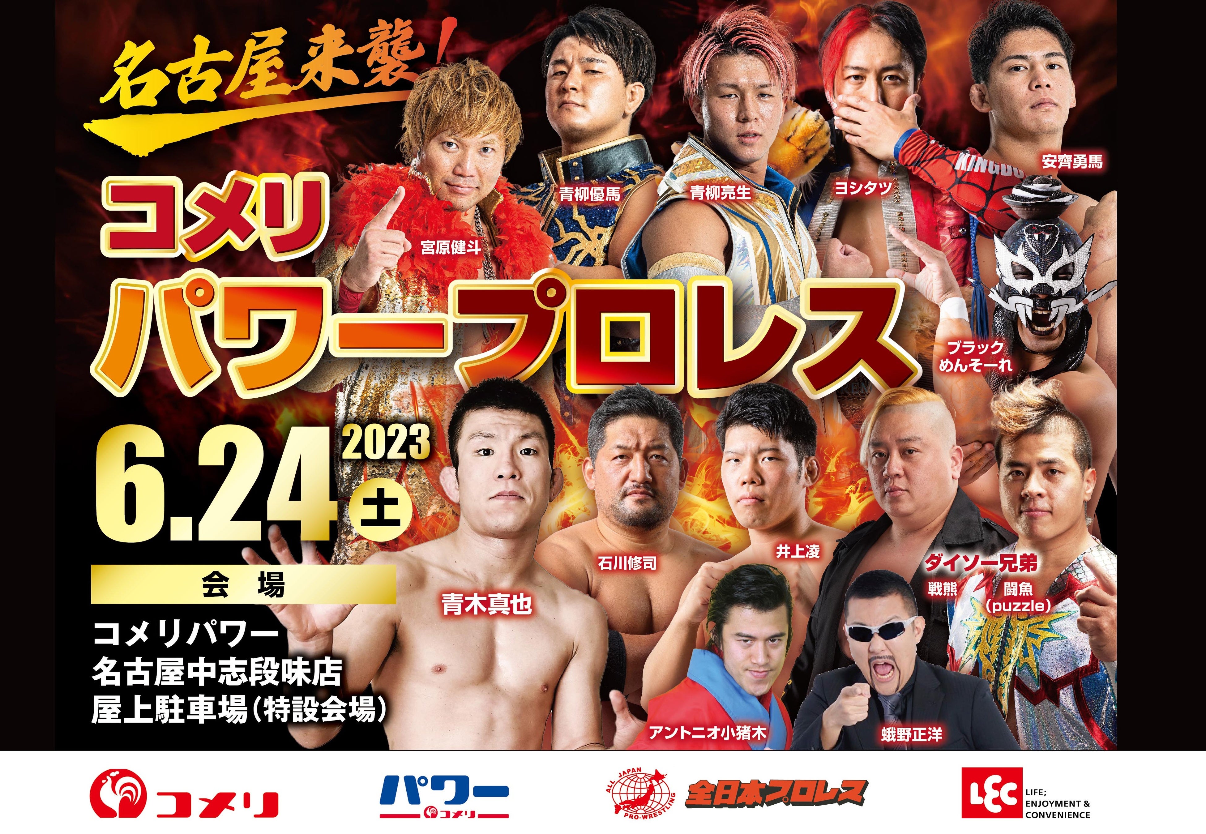 コメリとレック様および全日本プロレス様とのコラボイベントを開催いたします。コメリパワー名古屋中志段味店にてお買い物をしていただき、当社のコメリのアプリをダウンロード、マイストア登録していただいた方300名様をプロレスイベントにご招待いたします。その他にも各種イベントをご用意しておりますので、ぜひご参加ください。皆様のご来店をお待ちしております。