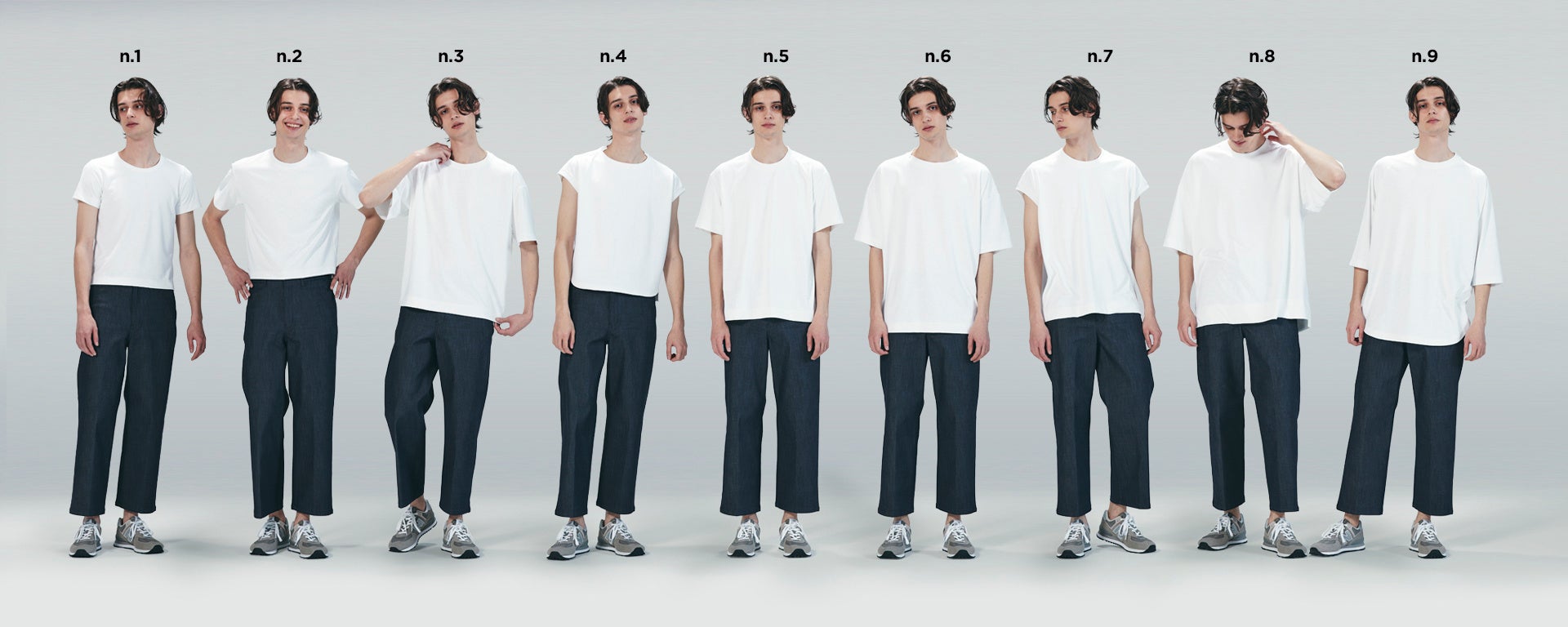 9つの中では一番ゆったりしたサイズ感で、ベースボールTeeをオーバーサイズにアレンジさせた袖をラウンドカットしたTシャツ。