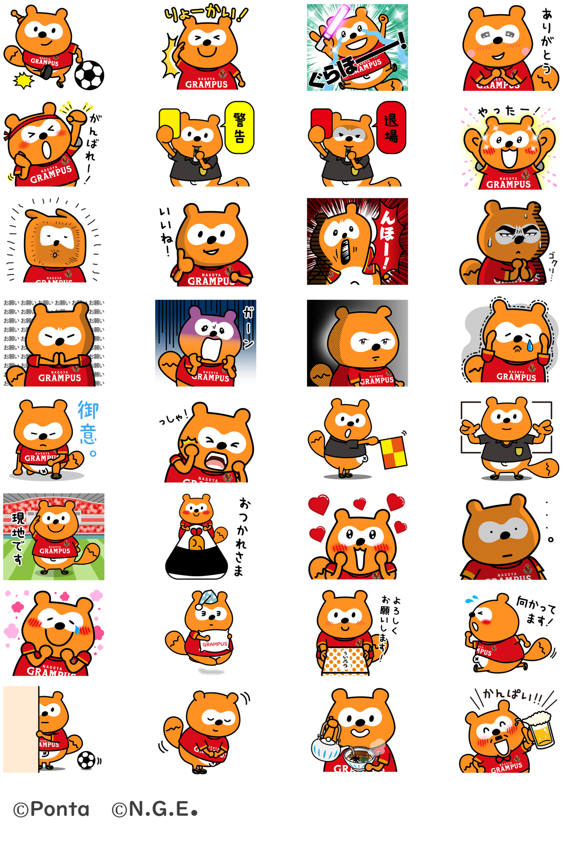グランパスポンタ公式Twitter(@nge_ponta)の投稿画像をアレンジしたイラストや、初のお披露目となる審判姿のポンタの描き下ろしイラストを含む、全32種類をご用意しました。名古屋グランパスの応援シーンはもちろん、毎日の会話を盛り上げるスタンプをお届けします。