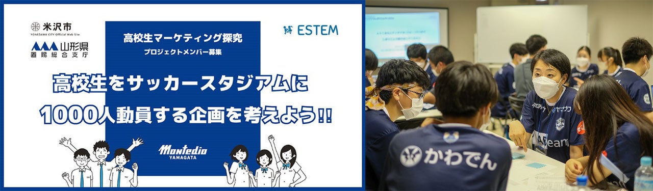 山形県置賜総合支庁の協力のもと38名の高校生を集め、探究教室「ESTEM」と協働し約2ヶ月に渡るプログラムを実行しました。 地方ならではの課題である「教育と実践の場」を創り出すことを目的とした本プロジェクトでは、1ヶ月目はマーケティングの基礎知識を学び、2ヶ月目は企画立案を行いました。最終プレゼンは1泊2日の合宿形式で行われ、そこで採用された企画が試合のイベントやプロモーションとして実現されました。